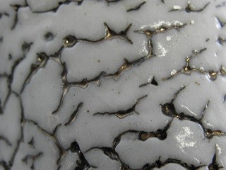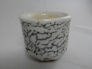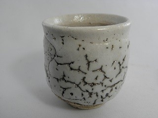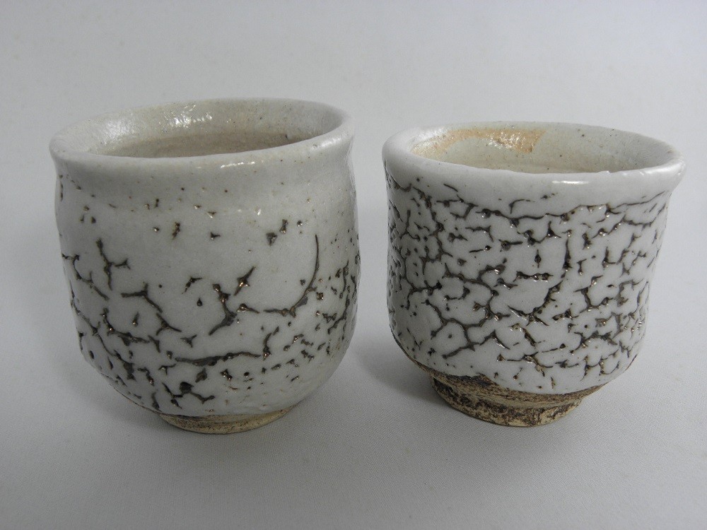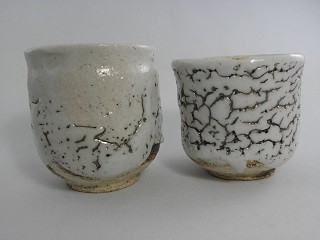 | ▲志野釉のかいらぎ(釉薬が割れた所)が金色に光る荒川明独自の世界の金窯変志野夫婦湯のみ |